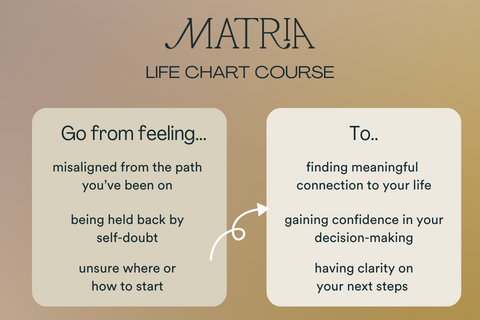 The Matria Life Chart Digital Course guides you through an annual planning framework that actually works. Transform "I don't know what's next" into "I know exactly what I want and I'm ready to claim it." Through strategic planning and intuitive wisdom, you'll gain the clarity to make those big decisions - whether it's leaving corporate, starting your venture, or prioritizing love and family. No more overthinking. No SMART goals. Just a proven framework for high-achieving women ready to create success that lights them up from the inside out. Enroll here: joinmatria.com/matrialifechartcourse